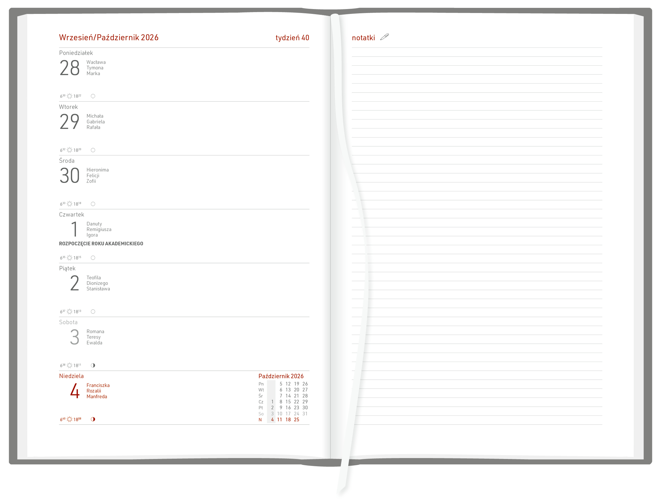 układ: tydzień na stronie + strona na notatki