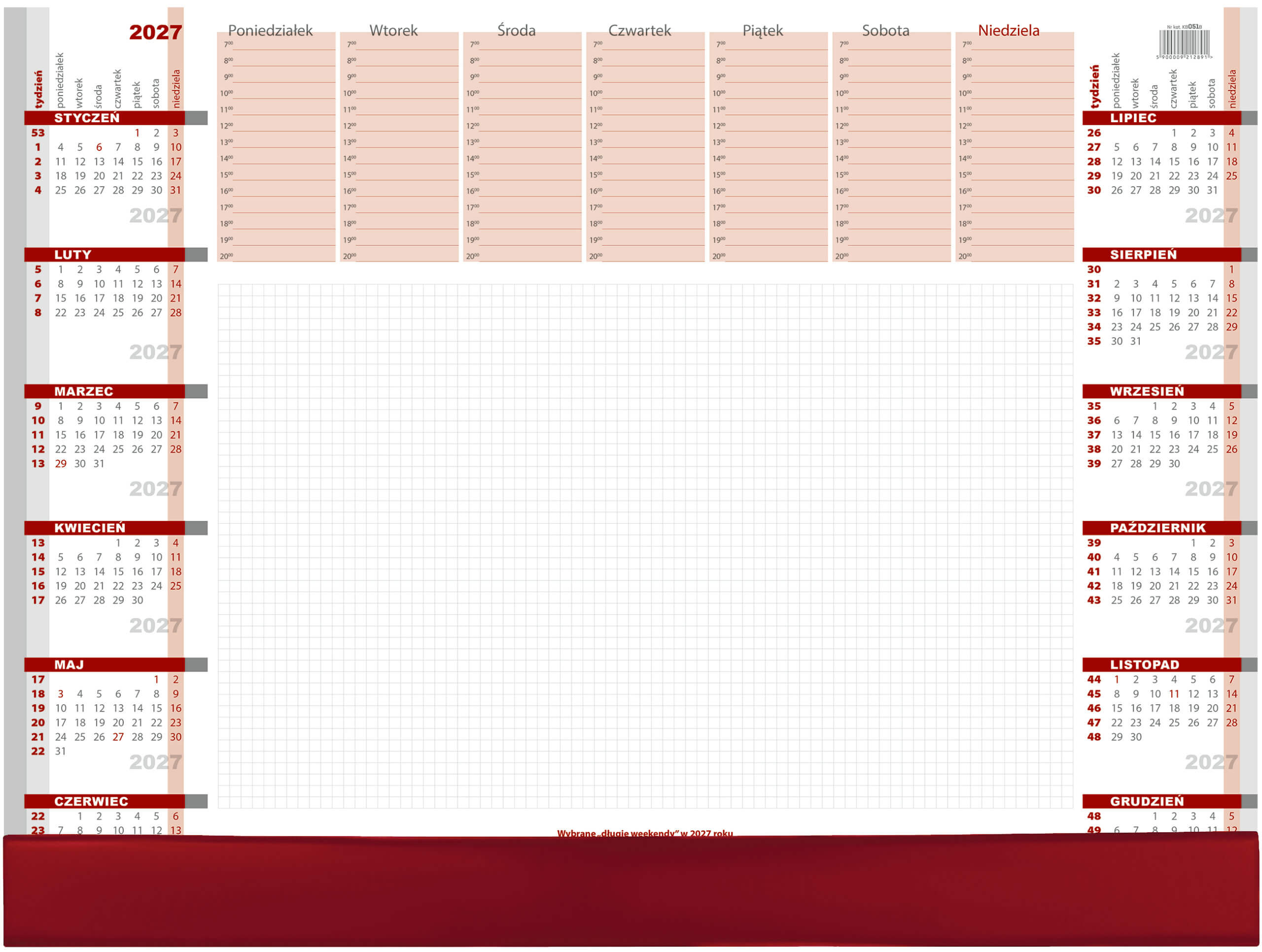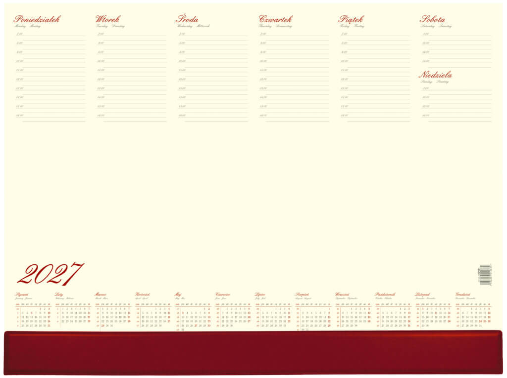 Praktyczny podkład na biurko z dużym obszarem do notowania, drukowany na papierze białym. Uchylna listwa PCV w kolorze bordowym w dolnej części kalendarza. Na listwie istnieje możliwość wykonania nadruku reklamowego na obszarze 550 x 40 mm.